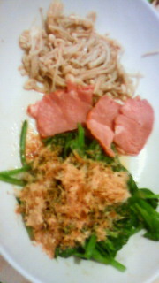 ほうれん草のおひたしとしめじとスモークタン晩ご飯。